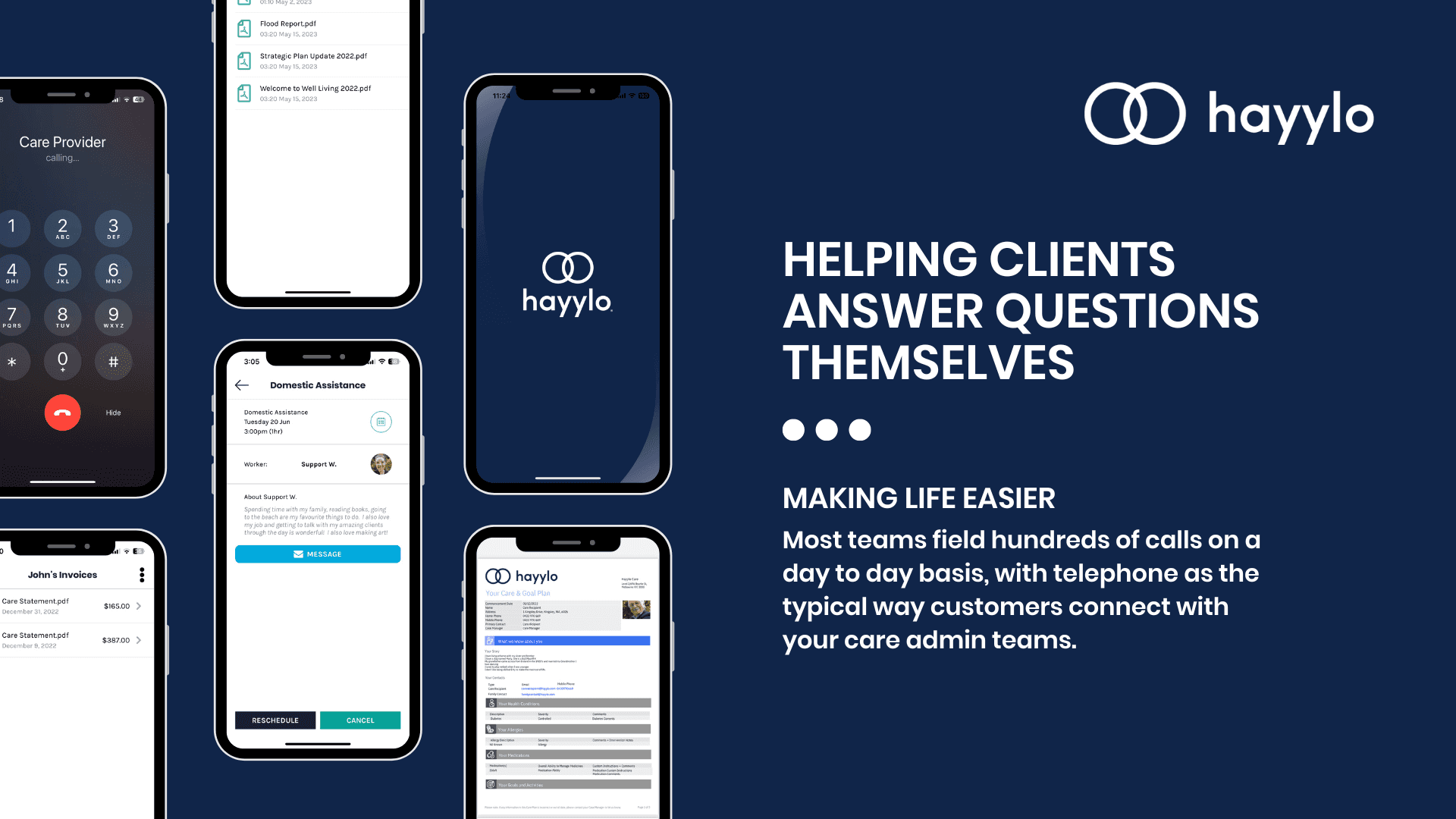Hayylo is the leading care service platform across community services with self-service features that helps teams by ensuring customers can answer questions themselves. Today customers have lots of questions across community services. Most of them are around who's coming, when and simple requests to change or cancel visits. Most teams field hundreds of calls on a day to day basis, with telephone as the typical way customers connect with your care admin teams. In fact, the effort from these calls adds up to hundreds of hours per month. Hayylo is a leading care service platform that connects clients and families to teams, removing repetitive tasks, keeping everyone informed saving time, effort and cost. If you are going through or planning an upgrade reach out to us to find out more about how to support your team, head over www.hayylo.com